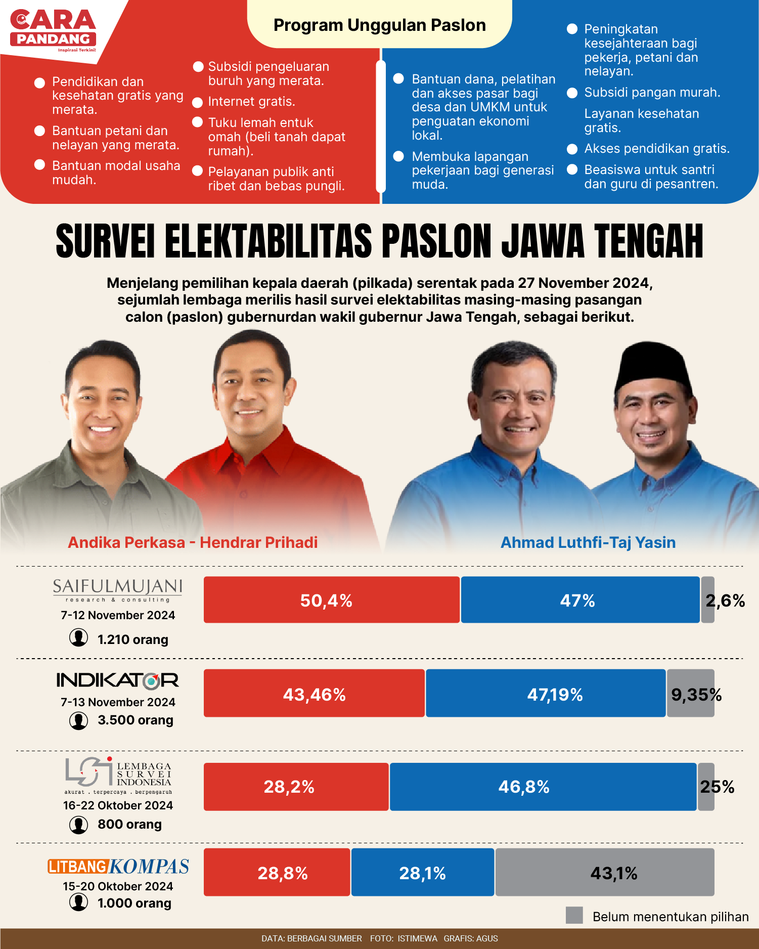 CARAPANDANG - Menjelang pemilihan kepala daerah (pilkada) serentak pada 27 November 2024, sejumlah lembaga merilis hasil survei elektabilitas masing-masing pasangan calon (paslon) gubernur dan wakil gubernur Jawa Tengah.