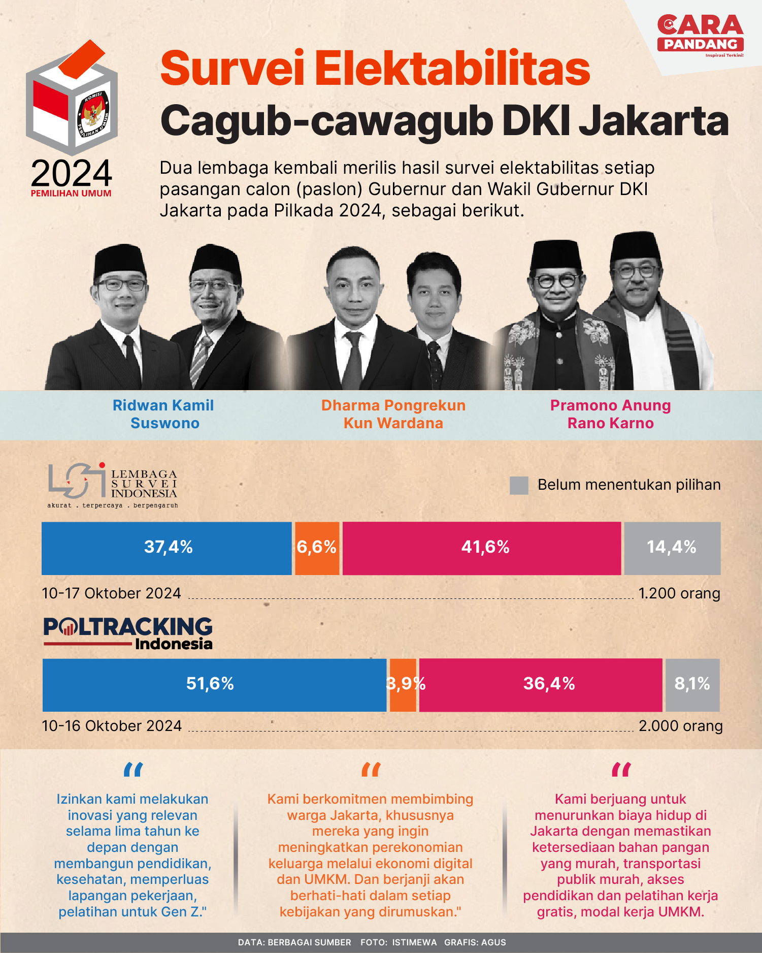 CARAPANDANG.COM - Sejumlah lembaga survei telah memaparkan hasil surveinya jelang Pilkada Jakarta 2024 yang akan ditentukan dengan pemilihan pada 27 November 2024.