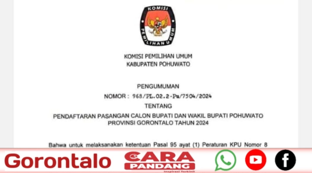 POHUWATO, CARAPANDANG - Komisi Pemilihan Umum (KPU) Kabupaten Pohuwato resmi mengeluarkan informasi pengumuman NOMOR: 968/PL.02.2-Pu/7504/2024 Tentang Pendaftaran Pasangan Calon Bupati dan Wakil Bupati Provinsi Gorontalo tahun 2024.