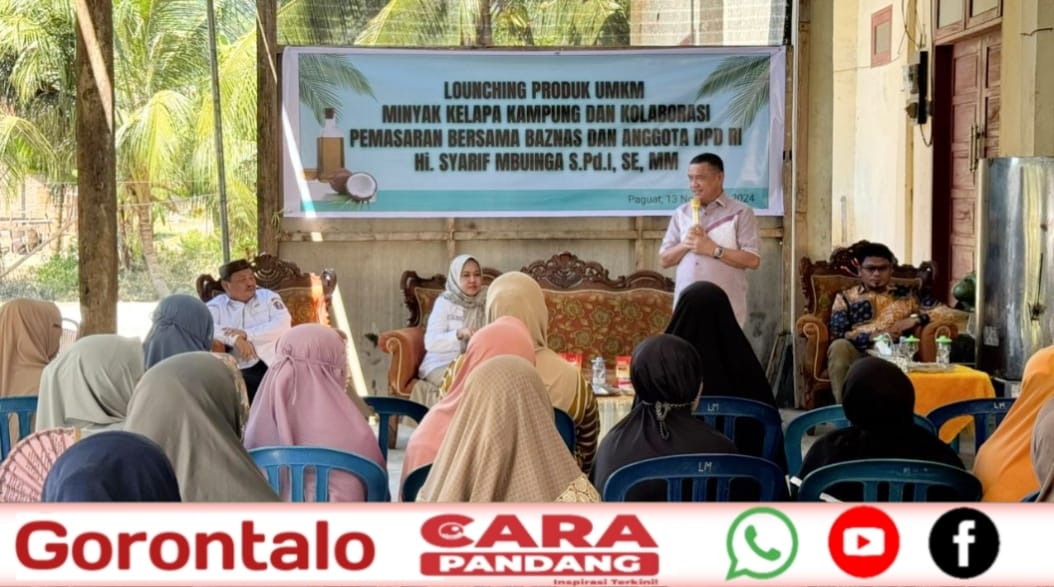 POHUWATO, CARAPANDANG - Anggota DPD-RI Dapil Provinsi Gorontalo, Syarif Mbuinga menghadiri Launching Produk UMKM Minyak Kelapa Kampung dan Kolaborasi Pemasaran Bersama Baznas dan Anggota DPD-RI.