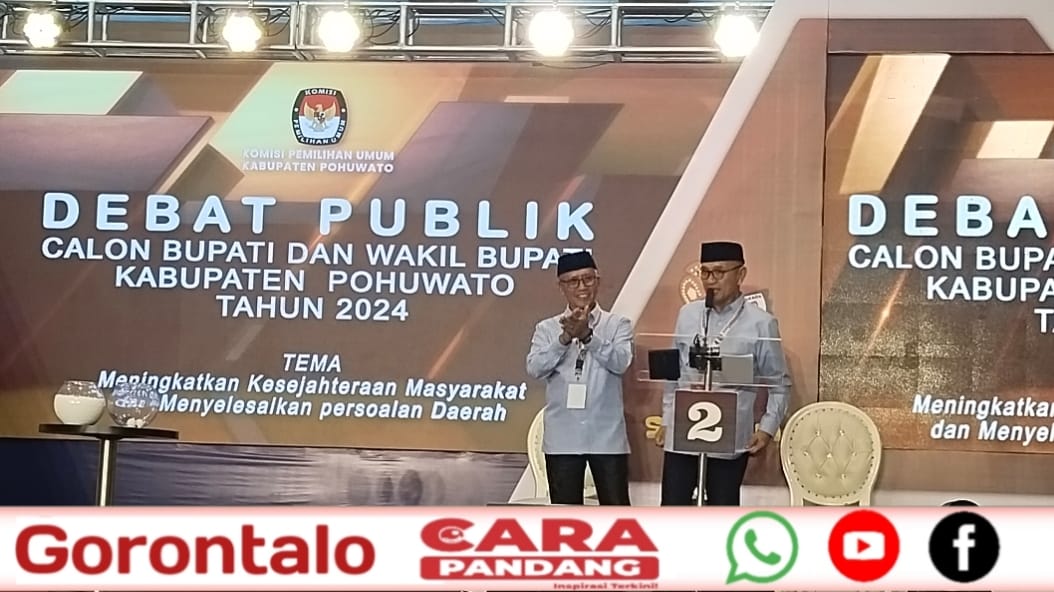 POHUWATO, CARAPANDANG - Pasangan Calon (Paslon) Bupati dan Wakil Bupati Pohuwato nomor urut 2, Saipul A. Mbuinga dan Iwan S. Adam (SIAP) tampil gagah pada Debat Publik pertama yang digelar oleh Komisi Pemilihan Umum (KPU) Pohuwato, di gedung Damhil Universitas Negeri Gorontalo (UNG), pada Minggu malam (27/10/2024).