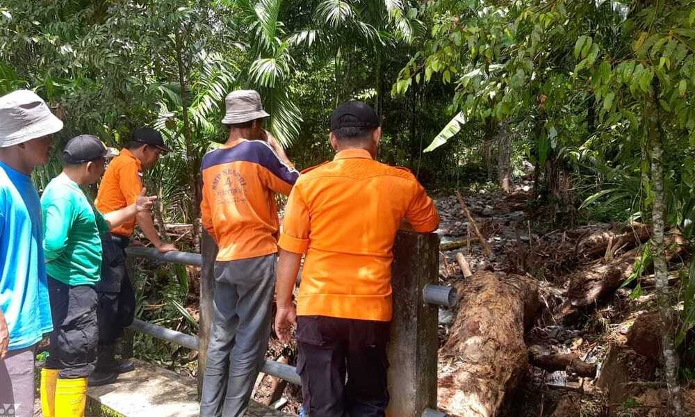 Material Longsor berupa kayu-kayu besar menyumbat aliran sungai dan dikhawatirkan air meluap ke jalan.