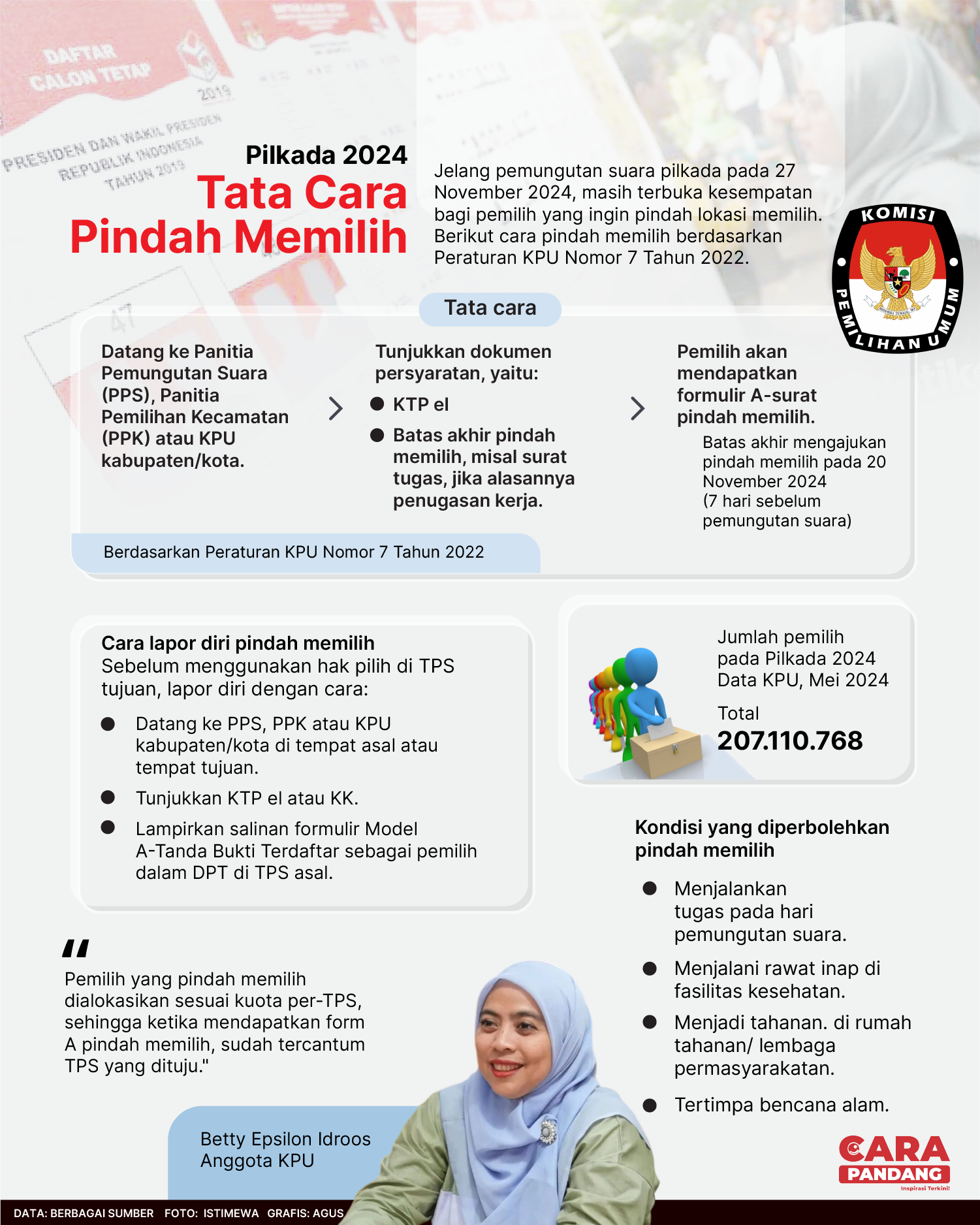 CARAPANDANG - Menjelang pemungutan suara Pilkada 27 November 2024, Komisi Pemilihan Umum (KPU) masih memberikan kesempatan kepada pemilih untuk mengubah lokasi pemungutan suara mereka. Inilah prosedur untuk mengganti tempat pemungutan suara sesuai dengan Peraturan KPU Nomor 7 Tahun 2022.