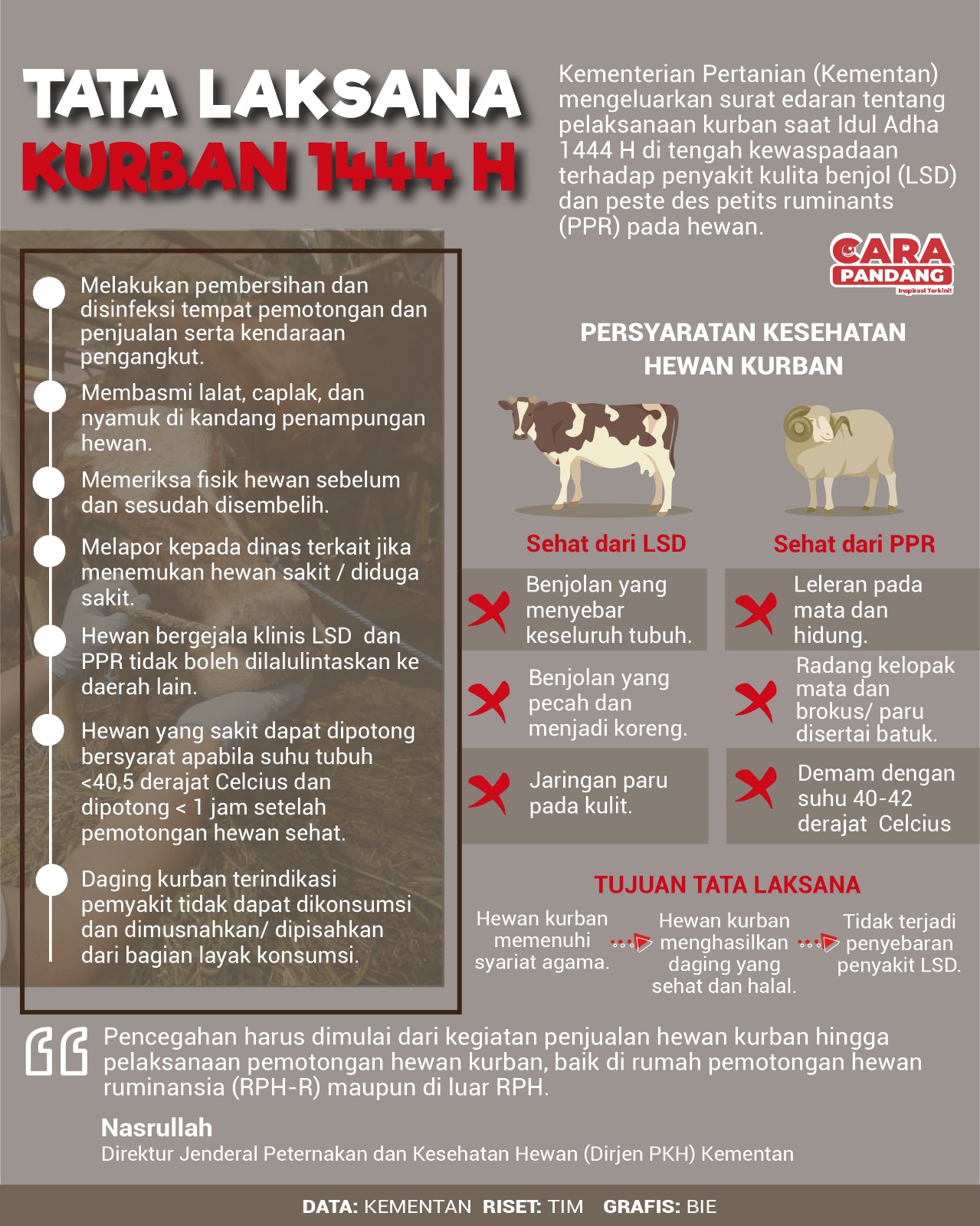 CARAPANDANG.COM - Kementerian Pertanian (Kementan) mengeluarkan surat edaran tentang pelaksanaan kurban saat Idul Adha 1444 H di tengah kewaspadaan terhadap penyakit kulita benjol (LSD) dan peste des petits ruminants (PPR) pada hewan.