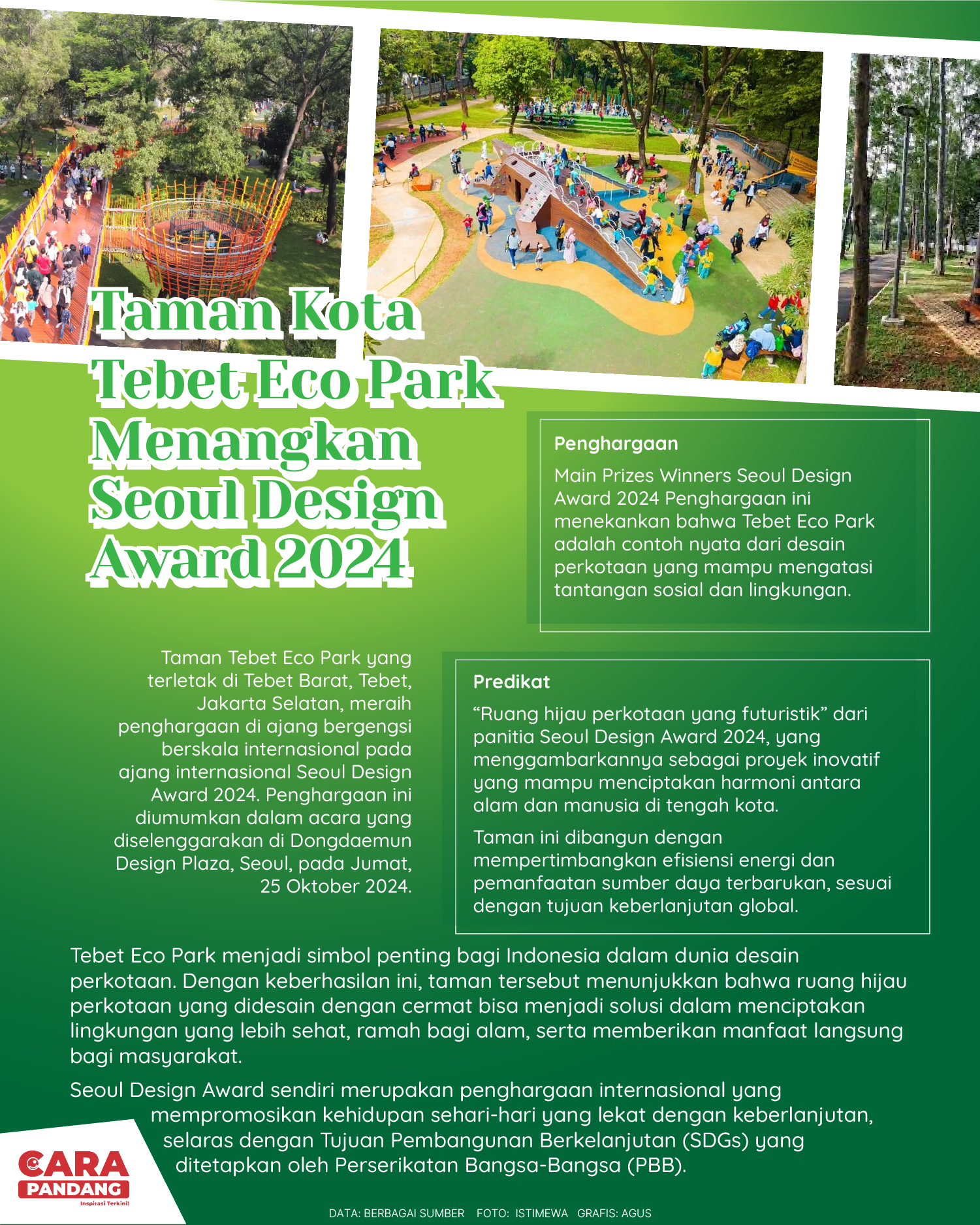 CARAPANDANG - Taman kota yang terletak di Jakarta Selatan, Tebet Eco Park (TEP), kembali mendulang prestasi tingkat global. Ruang terbuka hijau ini memenangi Seoul Design Award 2024.