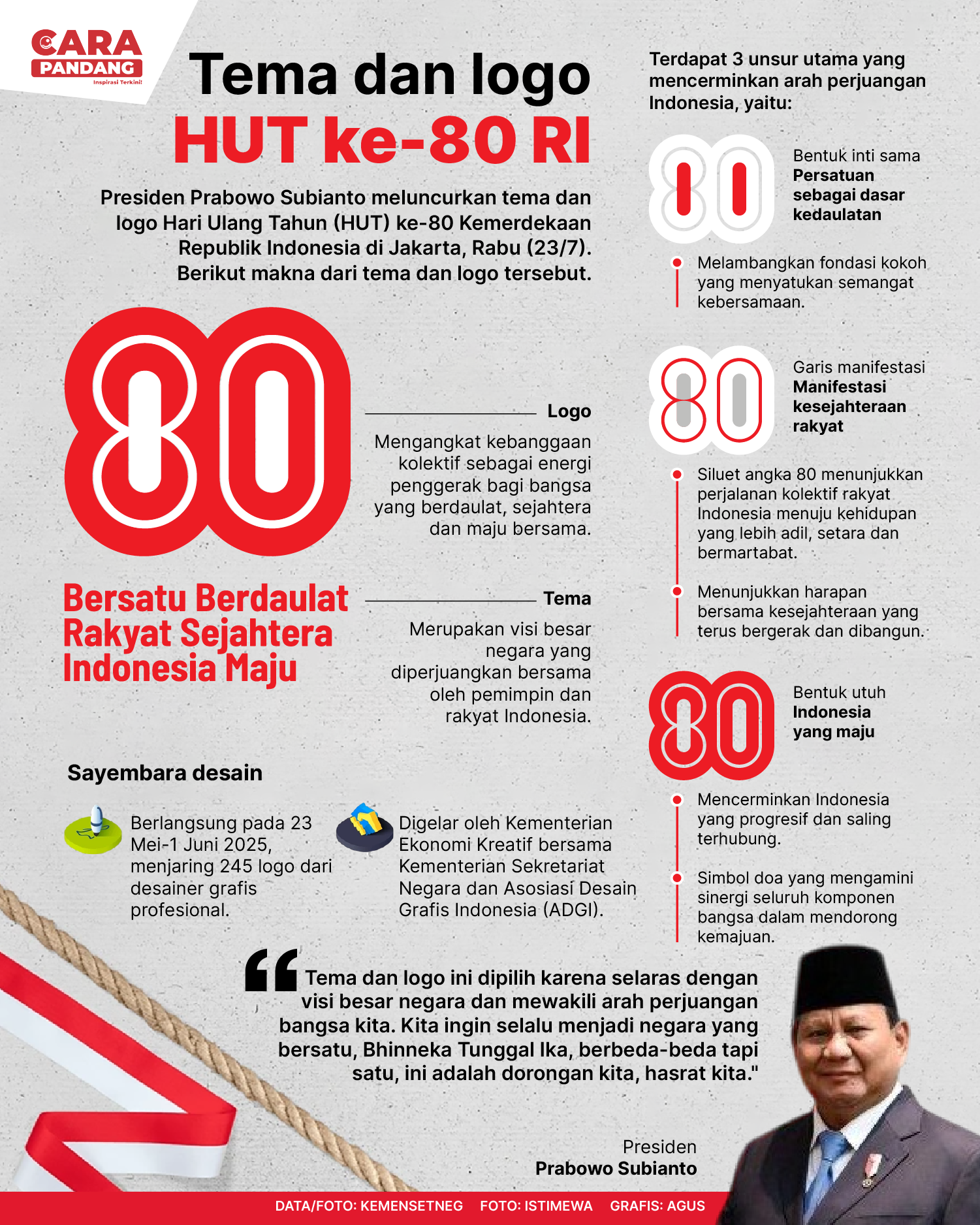 Beranda Infografis Tema dan Logo HUT ke 80 RI Infografis Tema dan Logo HUT ke 80 RI Tema dan Logo HUT ke 80 RI. Penulis Edo Soeryadi - 24 Juli 2025 11:02 0 CARAPANDANG.COM - Tema dan Logo HUT ke 80 RI. Tags HUTRI HUT RI Indonesia 80 Berita Sebelumnya Menbud: Tradisi Jamu Laut Sejalan Dengan Program Prioritas Berita Berikutnya Indonesia Dalam Dilema Misi Perdamaian Dunia LEAVE A REPLY Cancel reply Comment: Please enter your comment! Name:* Please enter your name here Email:* You have entered an incorrect email address! Please enter your email address here Website: Save my name, email, and website in this browser for the next time I comment. Berita Teratas Kisah Ajaib Nabi Sulaiman dan Anak yang Berbakti kepada Orang Tua 8 Cara Merawat Kucing Kesayangan Agar Tubuhnya Selalu Sehat Minuman yang Mampu Redakan Batuk yang Menganggu Manfaat Ajaib Bawang Putih Bagi Kesehatan 8 Cara Menjaga Kesehatan Gigi dan Mulut yang Efektif Berita Terkait Berita Terkait Wajah Baru PP Tunas: Garda Terdepan Perlindungan Anak Indonesia Zoel Rachman - 31 Maret 2026 09:42 MBG 5 Hari Sepekan Masih Wacana Maliq - 30 Maret 2026 11:49 Presiden Ingin Semua Kendaraan Dikonversi ke Listrik Maliq - 30 Maret 2026 11:48 Kewaijiban PSE Terhadap Pengguna Anak Maliq - 30 Maret 2026 11:15