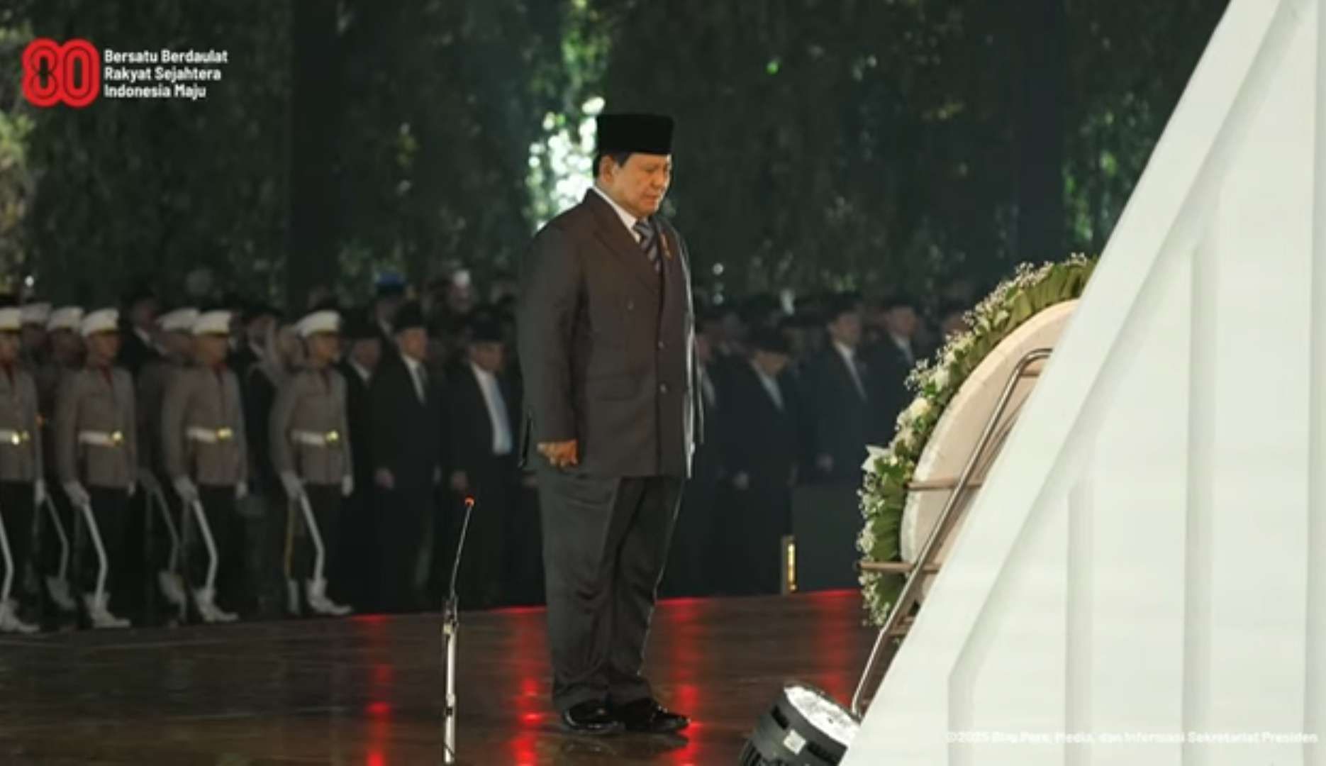CARAPANDANG - Presiden Prabowo Subianto memimpin upacara ziarah nasional dan renungan suci di Taman Makam Pahlawan (TMP) Kalibata, Minggu (17/8/2025). Kegiatan ini merupakan tradisi tahunan menjelang upacara detik-detik Proklamasi 17 Agustus sebagai bentuk penghormatan kepada para pahlawan.