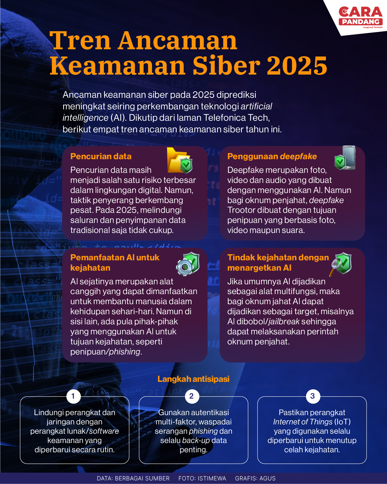 Beranda Infografis Tren Ancaman Keamanan Siber 2025 Infografis Tren Ancaman Keamanan Siber 2025 Penulis Amira Izzati - 20 Januari 2025 06:33 0 CARAPANDANG - Tren Ancaman Keamanan Siber 2025 Tags Berita Sebelumnya Ruben Amorim Timnya Terburuk dalam Sejarah MU Berita Berikutnya Indonesia Dalam Dilema Misi Perdamaian Dunia LEAVE A REPLY Cancel reply Comment: Please enter your comment! Name:* Please enter your name here Email:* You have entered an incorrect email address! Please enter your email address here Website: Save my name, email, and website in this browser for the next time I comment. Berita Teratas Kisah Ajaib Nabi Sulaiman dan Anak yang Berbakti kepada Orang Tua 8 Cara Merawat Kucing Kesayangan Agar Tubuhnya Selalu Sehat Minuman yang Mampu Redakan Batuk yang Menganggu Manfaat Ajaib Bawang Putih Bagi Kesehatan Lima Manfaat Super Makan Pisang Sebelum Tidur yang Jarang Diketahui Berita Terkait Berita Terkait Wajah Baru PP Tunas: Garda Terdepan Perlindungan Anak Indonesia Zoel Rachman - 31 Maret 2026 09:42 MBG 5 Hari Sepekan Masih Wacana Maliq - 30 Maret 2026 11:49 Presiden Ingin Semua Kendaraan Dikonversi ke Listrik Maliq - 30 Maret 2026 11:48 Kewaijiban PSE Terhadap Pengguna Anak Maliq - 30 Maret 2026 11:15