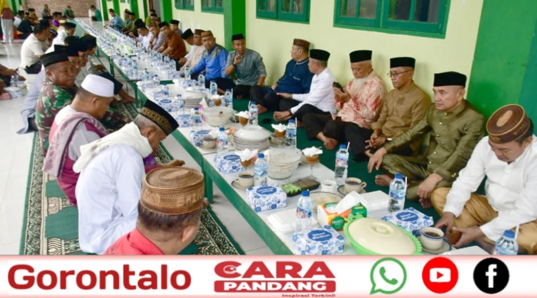 POHUWATO, CARAPANDANG - Usai mengikuti prosesi Mopotilolo di tiga kecamatan yang ada di wilayah barat Pohuwato, Bupati Saipul A. Mbuinga, dan Wakil Bupati, Iwan S. Adam melakukan buka puasa bersama di Masjid Besar Al-Munawwarah Kecamatan Popayato, Senin, (17/03/2025).