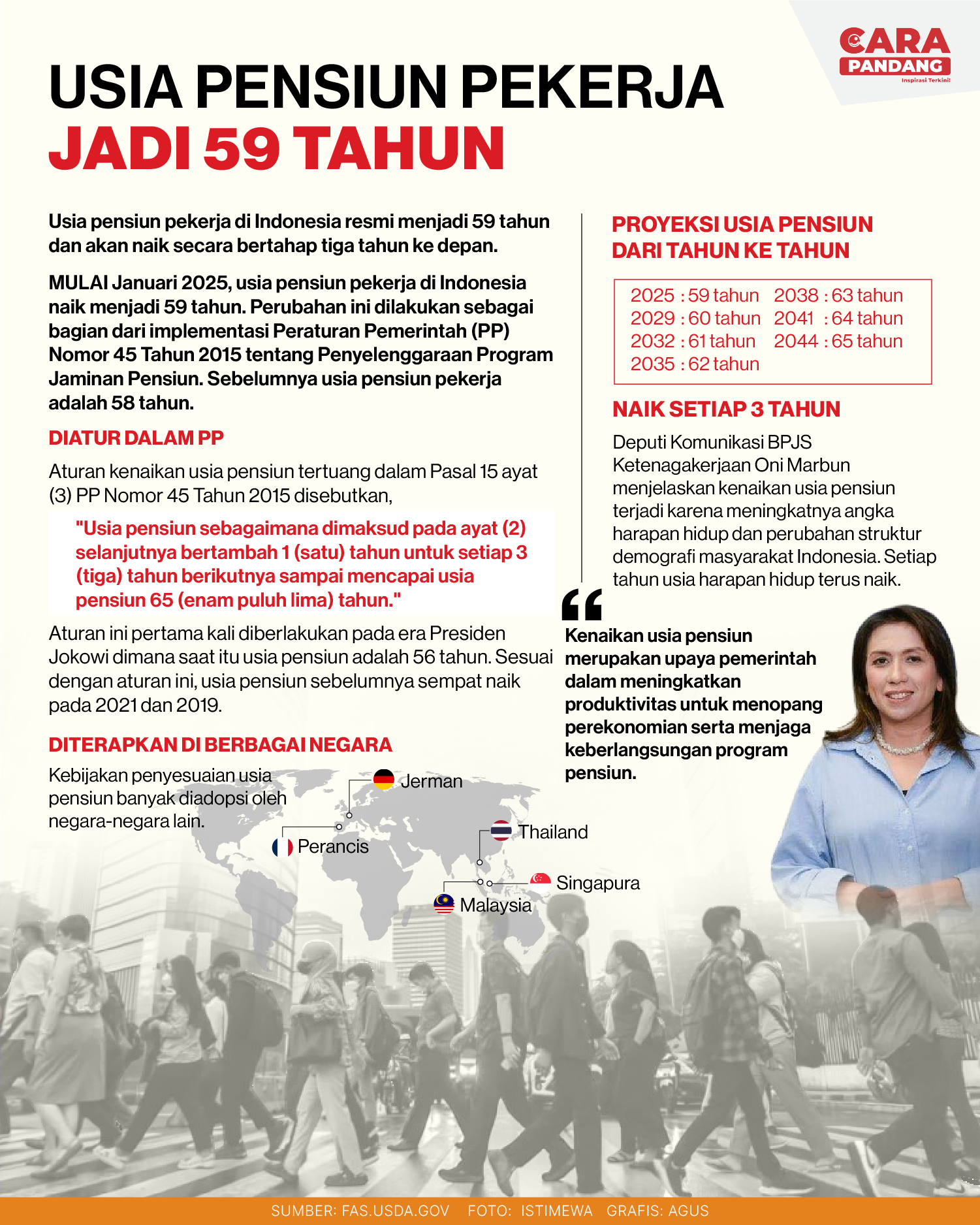 CARAPANDANG - Kementerian Ketenagakerjaan (Kemenaker) telah menegaskan bahwa usia pensiun pekerja Indonesia pada 2025 naik menjadi 59 tahun.
