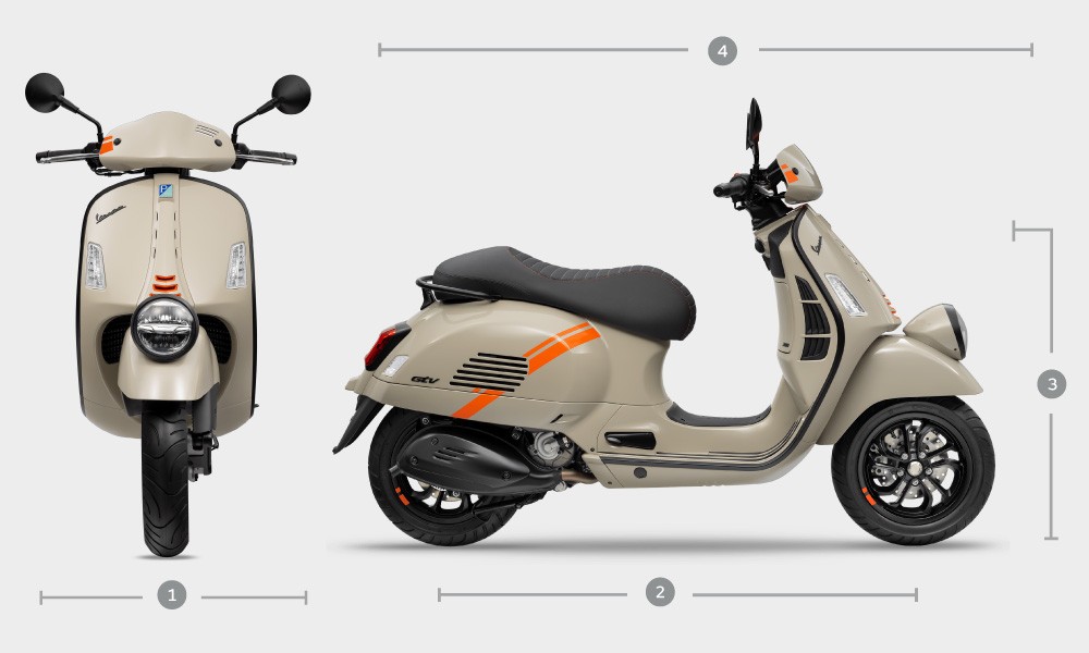 Vespa GTV tersedia dalam varian warna Beige Sabbia, dengan kombinasi warna khas Beige dengan corak grafis oranye yang kontras di sepanjang panel kendaraan.