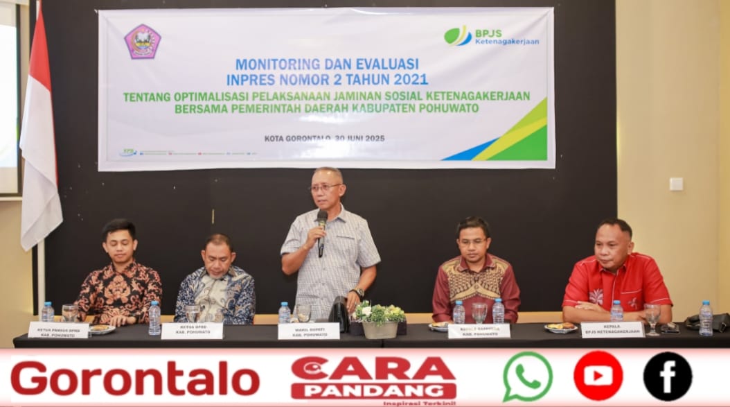 POHUWATO, CARAPANDANG - Wakil Bupati Pohuwato, Iwan S. Adam, secara resmi membuka kegiatan Monitoring dan Evaluasi (Monev) pelaksanaan Instruksi Presiden (Inpres) Nomor 2 Tahun 2021 tentang Optimalisasi Pelaksanaan Jaminan Sosial Ketenagakerjaan, Senin, (30/06/2025) di Grand Q Hotel, Kota Gorontalo.
