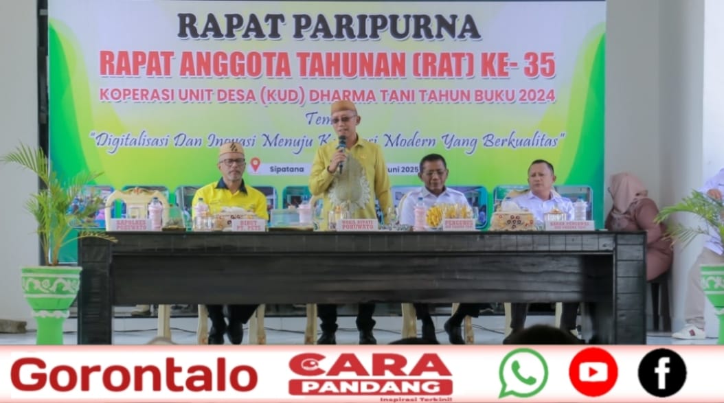 POHUWATO, CARAPANDANG - Wakil Bupati Pohuwato, Iwan S. Adam, secara resmi membuka Rapat Anggota Tahunan (RAT) ke-35 Koperasi Unit Desa (KUD) Dharma Tani Tahun Buku 2024 yang digelar pada Kamis, (19/06/2025), bertempat di Kantor KUD Dharma Tani, Kecamatan Duhiadaa.