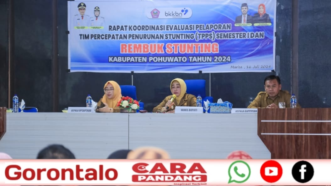 Wakil Bupati Suharsi Igirisa, yang juga selaku Ketua Tim Percepatan Penurunan Angka Stunting (TPPS) Pohuwato, saat membuka kegiatan mengatakan, rakor evaluasi pelaporan TPPS semester I dan rembuk stunting Kabupaten Pohuwato tahun 2024 tujuannya untuk memastikan komitmen daerah dalam melaksanakan program kegiatan aksi konvergensi pencegahan stunting melalu TPPS, baik yang terkait dengan kegiatan intervensi gizi sensitif serta kegiatan-kegiatan inovatif yang memiliki daya ungkit terhadap penurunan prevalensi stunting di Kabupaten Pohuwato. “Apresiasi dan penghargaan kepada tim dan peserta rakor TPPS dan rembuk stunting, semoga kehadiran bapak/ibu dapat memberi spirit dan semangat baru untuk meneguhkan komitmen bersama dalam rangka mendorong derajat kesehatan masyarakat”,ungkap Suharsi.