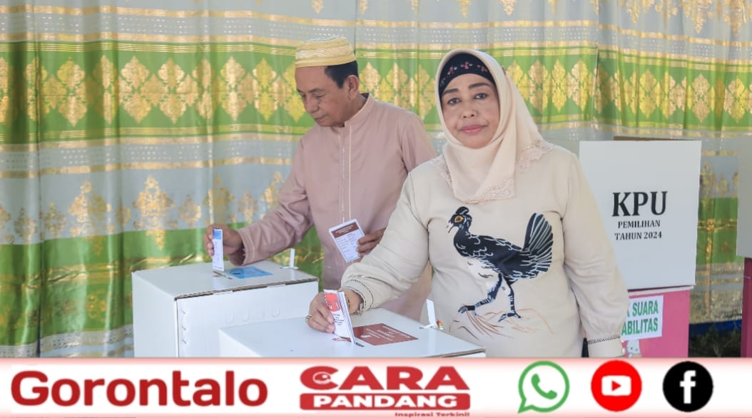 POHUWATO, CARAPANDANG - Wakil Bupati Pohuwato, Suharsi Igirisa, bersama suami, Abubakar Alhasni, menyalurkan hak pilihnya dalam Pemilihan Kepala Daerah (Pilkada) serentak 2024. Keduanya melakukan pencoblosan di Tempat Pemungutan Suara (TPS) 01 Desa Popayato pada Rabu, ( 27/11/2024).