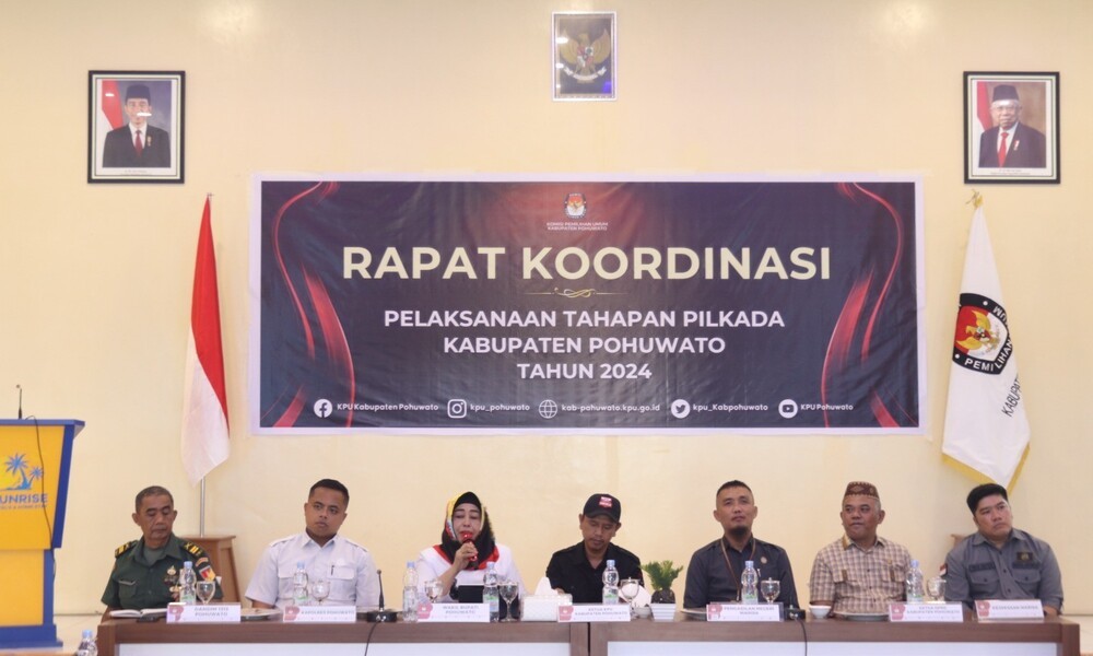 POHUWATO, CARAPANDANG - Wakil Bupati Pohuwato, Suharsi Igirisa menghadiri Rapat Koordinasi, dalam rangka Pelaksanaan Tahapan Pilkada Kabupaten Pohuwato tahun 2024, yang berlangsung di Sunrise Hotel and Homestay, Rabu (24/4/2024).
