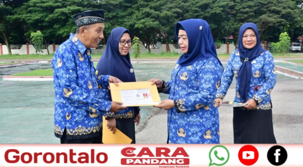 POHUWATO, CARAPANDANG - Dalam suasana khidmat pada Apel Korpri awal tahun yang berlangsung di halaman kantor sementara Bupati Pohuwato, Wakil Bupati, Suharsi Igirisa menyerahkan Surat Keputusan (SK) Pensiun kepada dua Aparatur Sipil Negara (ASN) yang memasuki masa purna tugas pada Januari dan Februari 2025, Jum’at, (17/01/2025).