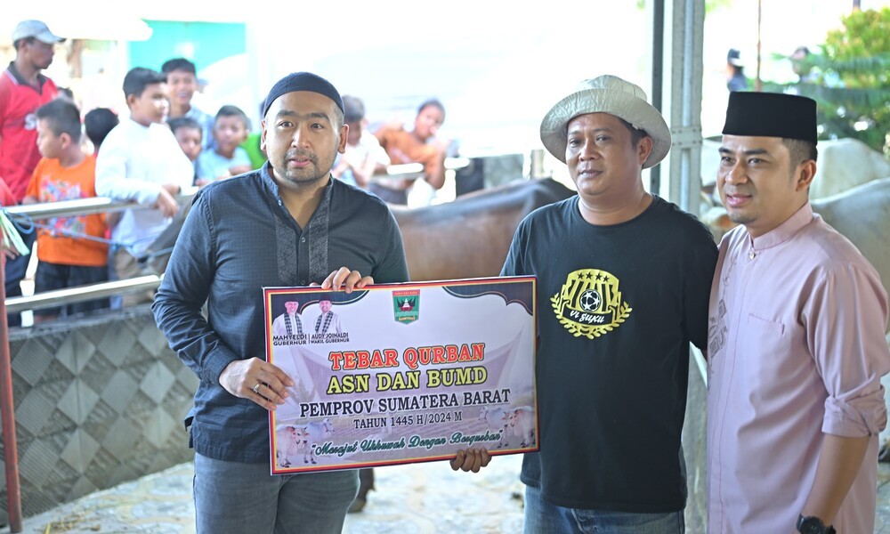 "Alhamdulillah, hari ini kita di Pemprov Sumbar berkeliling menyalurkan dan menyaksikan penyembelihan hewan qurban bantuan ASN dan BUMD Pemprov Sumbar untuk masyarakat. Di saat bersamaan, Bapak Gubernur menyerahkan bantuan serupa di Kabupaten Tanah Datar dan Pak Sekda di Kabupaten Agam," ucap Wagub Audy.