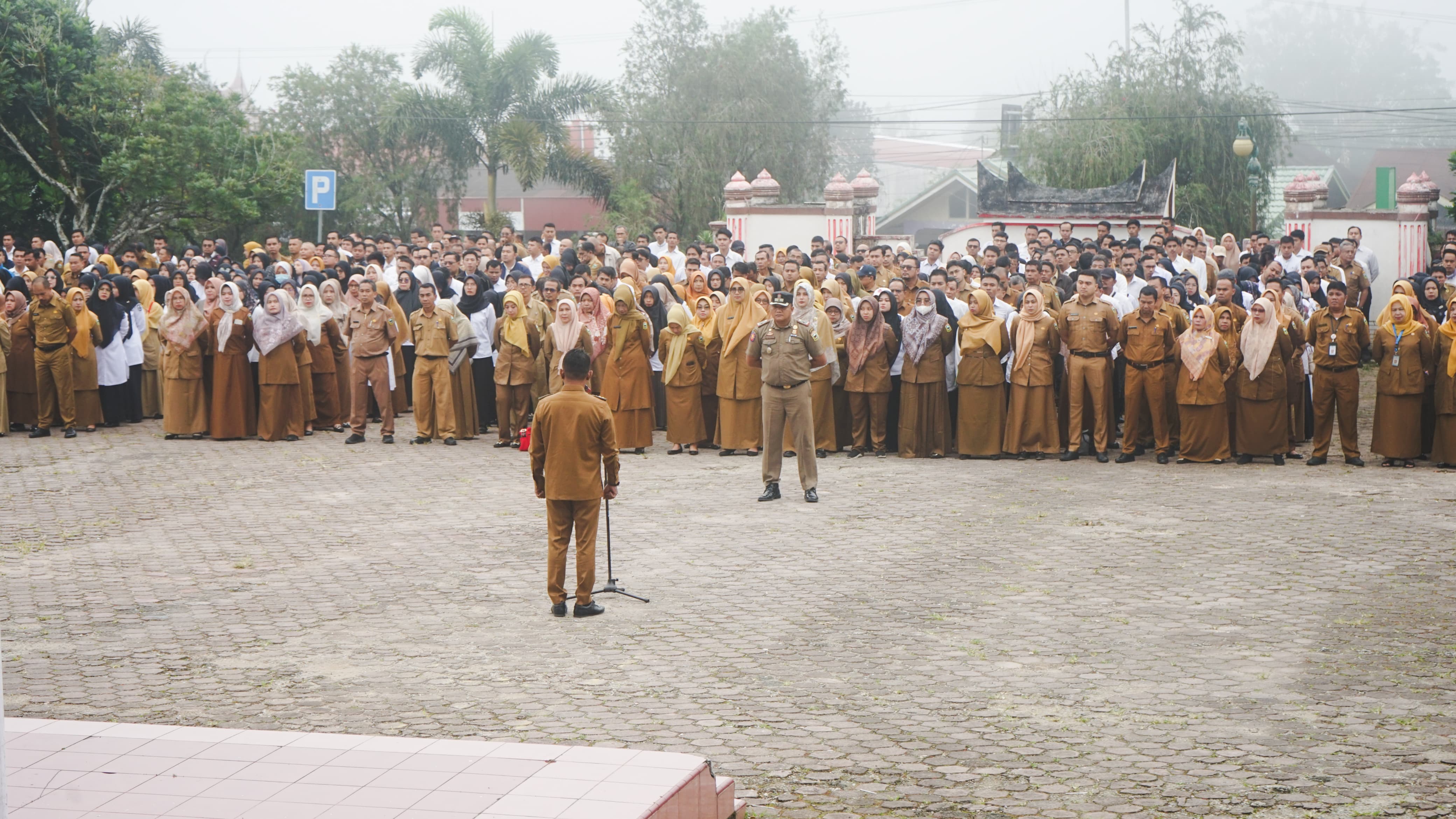 Wakil Bupati Solok, Jon Firman Pandu, SH, memimpin apel yang dihadiri Sekretaris Daerah Medison, S.Sos., M.Si., para Staf Ahli Bupati, Asisten Bupati, Kepala OPD, Camat se-Kabupaten Solok, ASN, dan THL lingkup Pemerintah Kabupaten Solok.