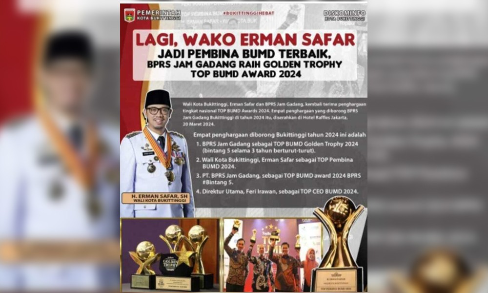 Beranda Kota Bukittinggi Wako Erman Safar Jadi Pembina BUMD Terbaik, BPRS Jam Gadang Raih Golden Trophy Top BUMD Award