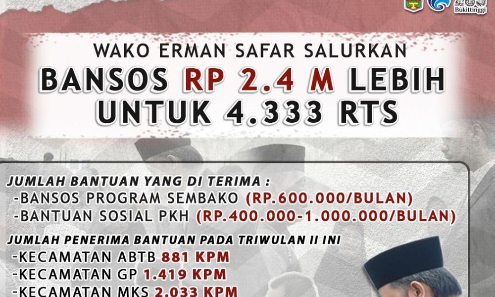 Wali Kota Bukittinggi, menyampaikan, penerima bantuan sosial Sembako triwulan II periode ini diberikan dari bulan April hingga Juni tahun 2024. Para penerima bansos program sembako ini mendapatkan bantuan sebanyak Rp. 600.000 perbulan dan untuk Penerima Bantuan Sosial PKH menerima dengan jumlah bervariasi mulai dari Rp 400.000 sampai dengan Rp. 1.000.000,-.