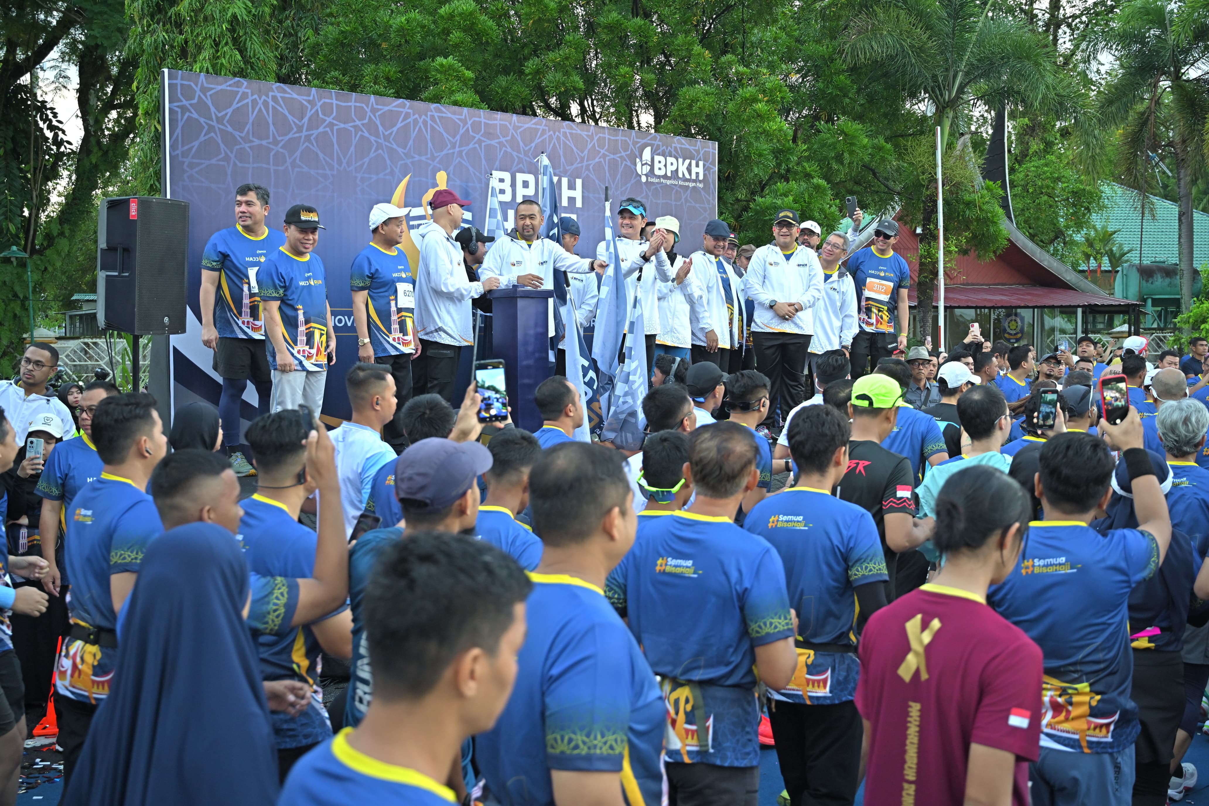 SUMBAR, CARAPANDANG - Plt Gubernur Sumatera Barat (Sumbar), Audy Joinaldy beserta Wakil Menteri Agama (Wamenag) RI, Muhammad Syafi'i, resmi melepas ratusan peserta "BPKH Hajj Run 2024" pada titik start di Halaman Istana Gubernur Sumatera Barat (Sumbar), Padang, Minggu (3/11). Iven tersebut diharapkan dapat meningkatkan pemahaman atas literasi keuangan haji serta pentinya kesehatan dalam menunaikan ibadah haji.
