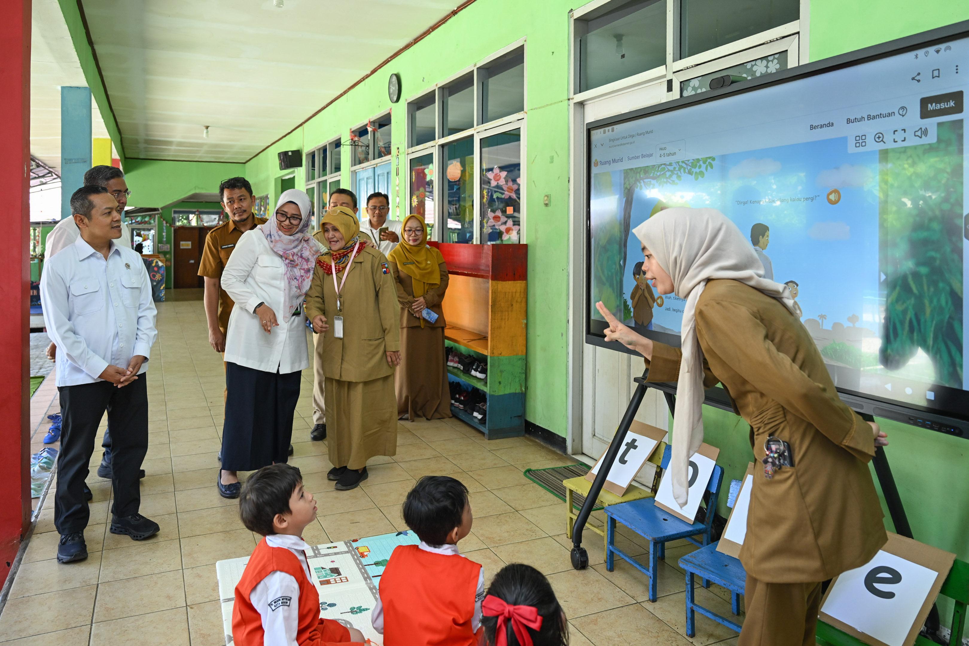 Turut mendampingi dalam kegiatan tersebut Direktur PAUD Kemendikdasmen, Nia Nurhasanah, yang meninjau penggunaan perangkat Papan Interaktif Digital atau Interactive Flat Panel (IFP) di dua taman kanak-kanak, yaitu TK Aisyiyah Busthanul  Athfal (ABA) V dan TK Negeri Motekar.