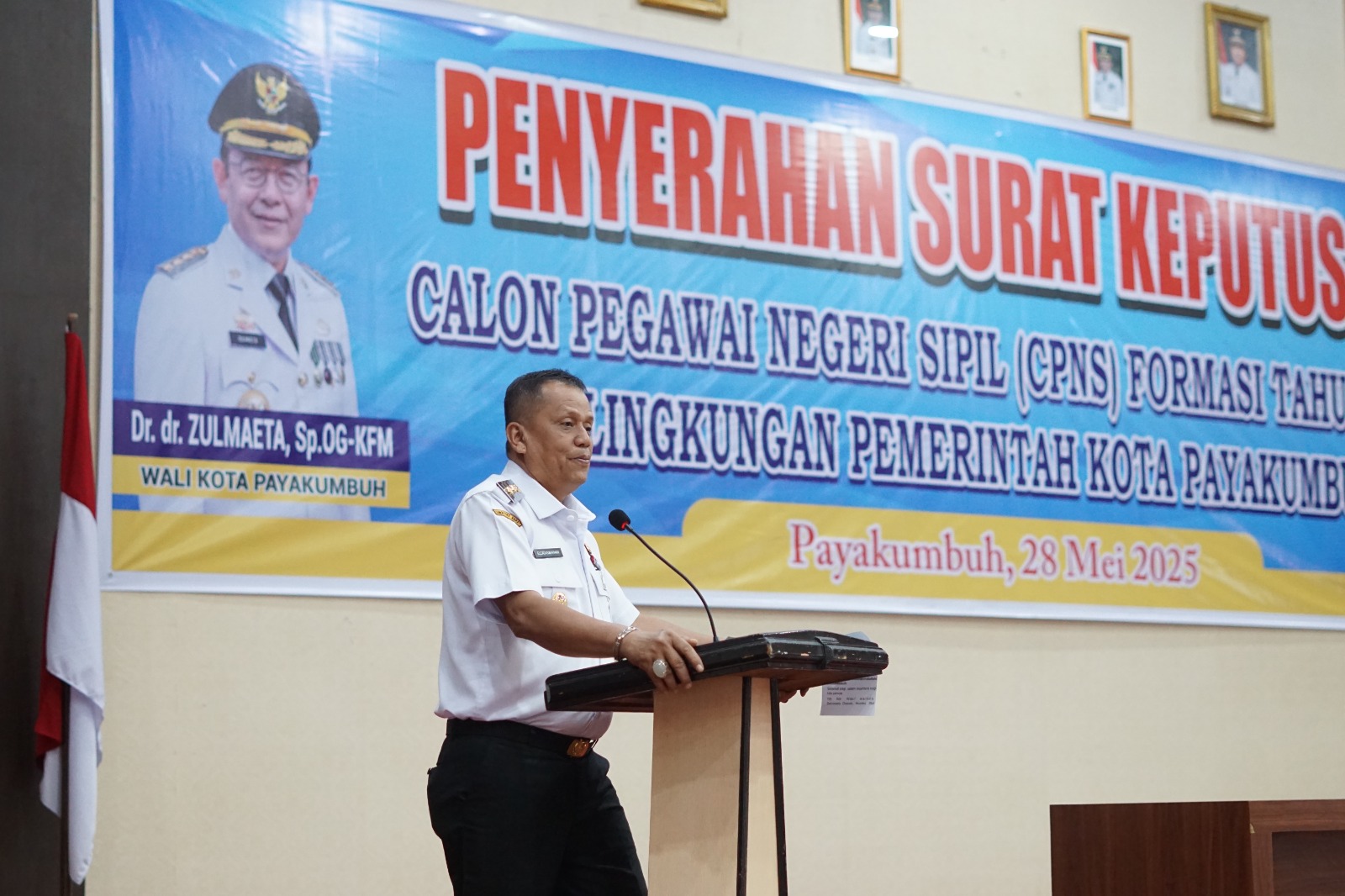 PAYAKUMBUH, CARAPANDANG - Sebanyak 32 Calon Pegawai Negeri Sipil (CPNS) formasi tahun 2024 di lingkungan Pemerintah Kota Payakumbuh resmi dilantik oleh Wakil Wali Kota Payakumbuh, Elzadaswarman, Rabu (28/05/2025). Pelantikan berlangsung di Aula Ngalau Indah lantai 3 Balai Kota Payakumbuh pada pukul 22.00 WIB.