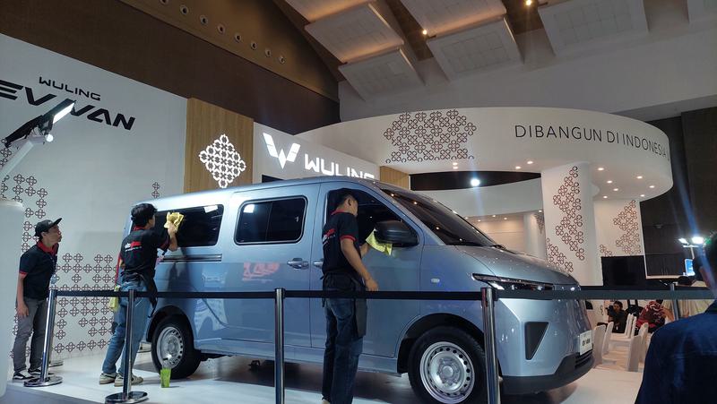Foto yang diabadikan pada 29 April 2025 ini menunjukkan produk baru Wuling yang dipamerkan dalam ajang Periklindo Electric Vehicle Show (PEVS) 2025 di Jakarta. (Xinhua)
