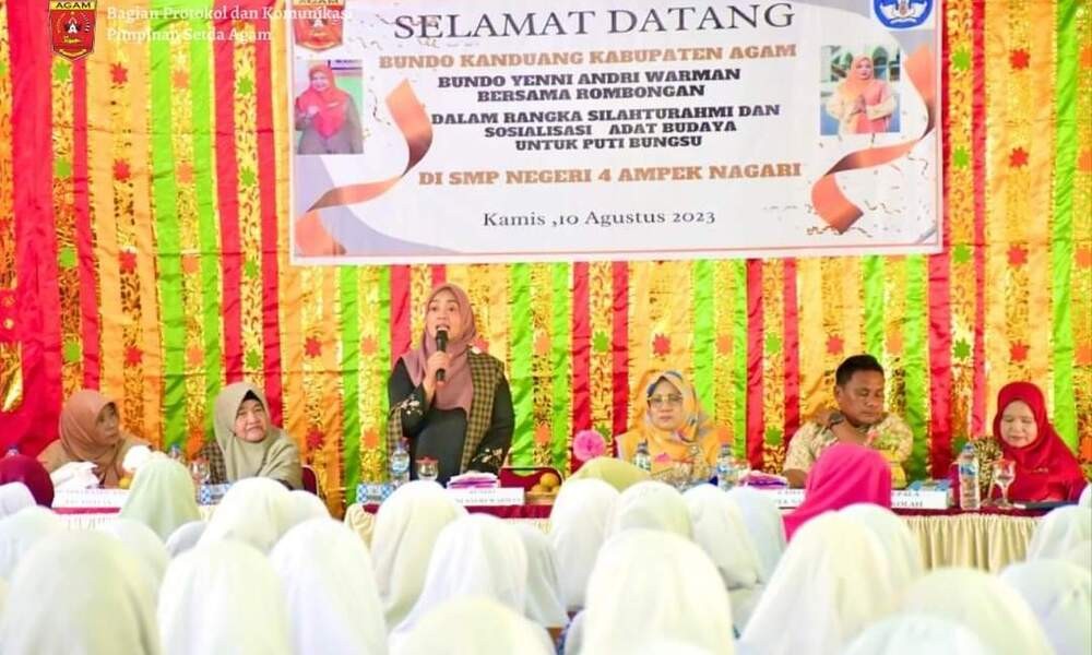AGAM, CARAPANDANG.COM - Penasehat Bundo Kanduang Kabupaten Agam Yenni Andri Warman berikan sosialisasi adat budaya bagi siswa dan majelis guru di SMP Negeri 4 Ampek Nagari. Kamis (10/08)